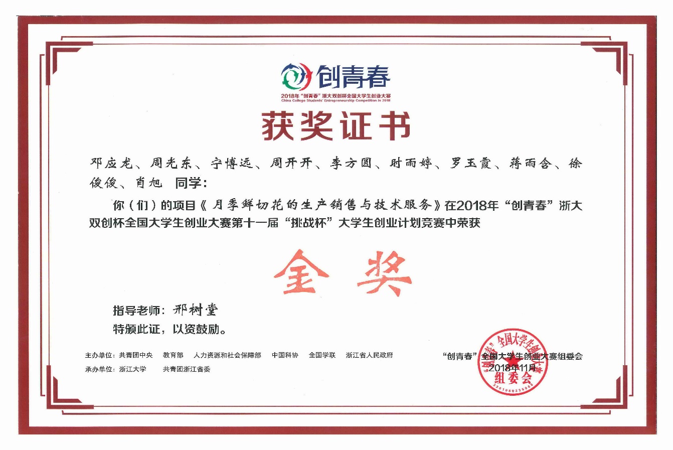 2018年11月3日,2018年“創(chuàng)青春”全國大學(xué)生創(chuàng)業(yè)大賽終審決賽在浙江大學(xué)落下帷幕。我校園藝學(xué)院“月季鮮切花的生產(chǎn)銷售與技術(shù)服務(wù)”項目獲得金獎、林學(xué)院“泰安山農(nóng)綠創(chuàng)環(huán)保工程有限公司”項目獲得銅獎。此項全國金獎也是我校首次獲得。