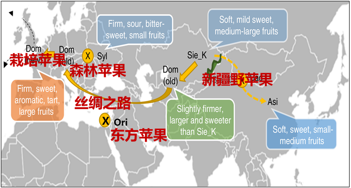 (一)針對蘋果種源依賴進口的問題,收集評價了全球具有代表性的蘋果等落葉果樹種質(zhì)材料1027份。證明了新疆野蘋果是世界栽培蘋果的原始祖先種,揭示了新疆豐富的野生資源是蘋果等重要落葉果樹的原始起源中心及天然種質(zhì)庫,為蘋果等落葉果樹的品種改良提供了重要基因資源。