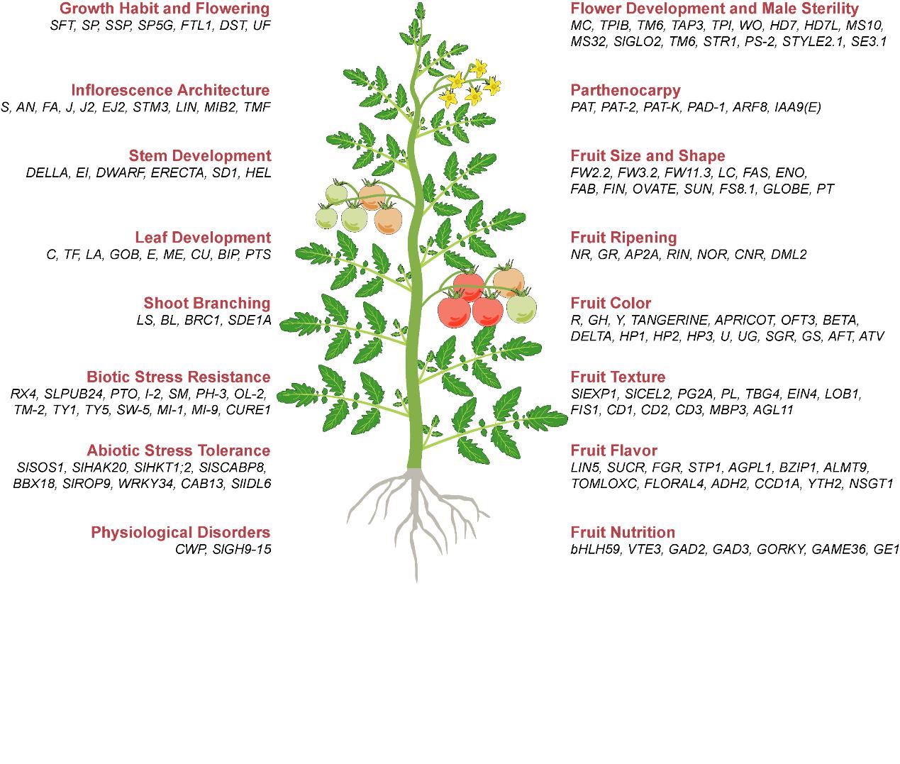 番茄(Solanum lycopersicum)是世界范圍內(nèi)廣泛種植的蔬菜作物,同時(shí)也是一種重要的水果替代品。現(xiàn)代栽培番茄起源于南美洲安第斯山脈,由野生醋栗番茄馴化改良而來(lái):第一步,醋栗番茄SP馴化為過(guò)渡種SLC;第二步,由過(guò)渡種SLC改良為現(xiàn)代栽培番茄SLL。現(xiàn)代栽培番茄根據(jù)其用途可分為鮮食番茄(水果用、沙拉用或菜用)和加工番茄(番茄泥、番茄罐頭、番茄醬和番茄汁等)兩大類。目前,中國(guó)已成為世界最大的番茄生產(chǎn)和消費(fèi)國(guó),年產(chǎn)量在6700萬(wàn)噸左右。除了作為重要的果蔬作物,番茄還是人們研究遺傳學(xué)、基因組學(xué)、果實(shí)發(fā)育和植物育種的經(jīng)典模式植物。以番茄為對(duì)象,人們發(fā)現(xiàn)了第一個(gè)多肽類植物激素系統(tǒng)素(systemin);構(gòu)建了作物中第一張高密度分子連鎖圖譜;克隆了作物中第一個(gè)數(shù)量性狀位點(diǎn)Fw2.2;在植物中首次克隆了符合“基因?qū)颉奔僬f(shuō)的抗病基因Pto以及鑒定了機(jī)械損傷誘導(dǎo)植物再生的原初信號(hào)分子REF1。過(guò)去30年,分子生物學(xué)和高通量測(cè)序技術(shù)等的飛速發(fā)展,特別是2012年番茄參考基因組測(cè)序完成和2013年CRISPR/CAS9基因編輯技術(shù)在植物中的應(yīng)用,極大推動(dòng)了番茄功能基因組學(xué)和遺傳育種方面的研究。迄今為止,人們已經(jīng)對(duì)超過(guò)300個(gè)番茄基因的功能進(jìn)行了深入的研究,其中一些基因在加速番茄性狀改良和品種培育方面發(fā)揮了重要作用。與此同時(shí),高效分子育種技術(shù)的蓬勃發(fā)展,包括基因編輯、全基因組選擇、單倍體育種及雄性不育制種等先進(jìn)技術(shù),正逐步融入番茄品種改良的實(shí)踐之中。這些技術(shù)的應(yīng)用,不僅提高了育種效率與精準(zhǔn)度,還為實(shí)現(xiàn)番茄作物的遺傳改良與產(chǎn)量提升開(kāi)辟了新途徑。
